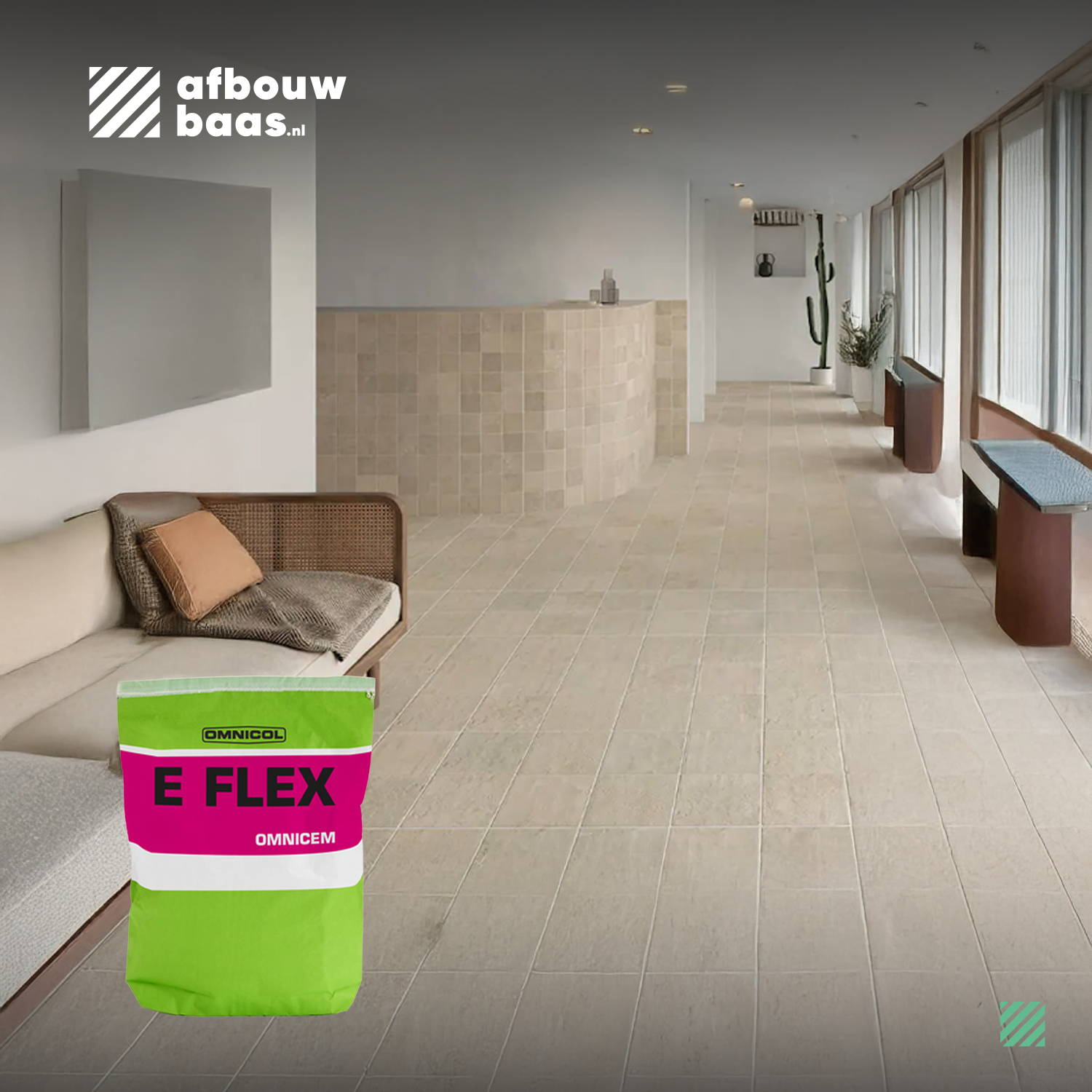 Omnicol E Flex wit 25KG (C2TE.S1) tegellijm is een hoogwaardige, flexibele witte tegellijm, speciaal ontwikkeld voor het verlijmen van natuursteen en lichte keramische tegels. De witte kleur voorkomt verkleuring van lichtgekleurde of doorzichtige tegels en natuursteen, waardoor de uitstraling optimaal behouden blijft.